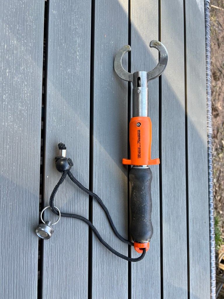 The center of the device features an orange “plunger” that you pull to open the grippers. Once pulled back enough, the mechanism locks the jaws into place. A conveniently placed button allows you to release the lock so the jaws can close—ideally around the fish’s mouth.